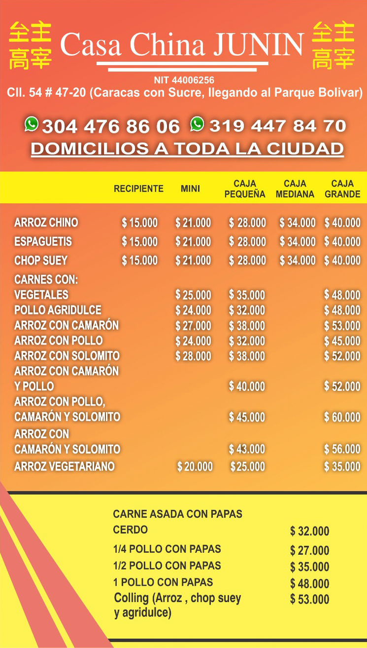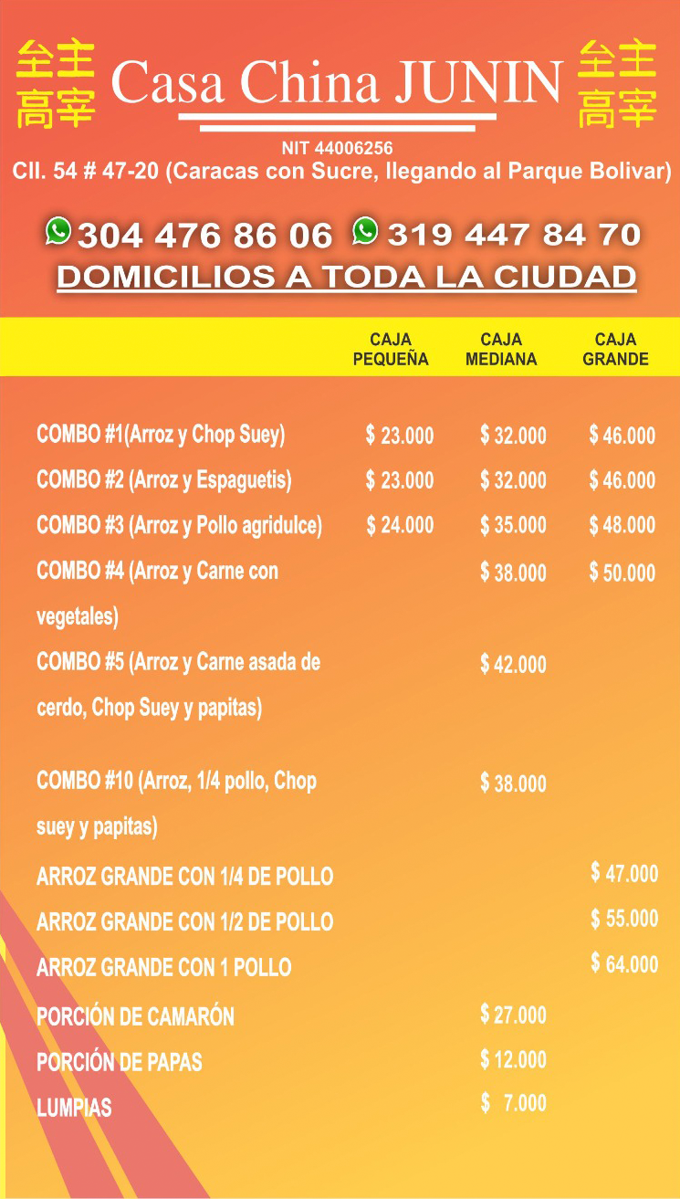 Somos CASA CHINA JUNIN, especializados en comida china y restaurante ubicado en el centro de Medellín (caracas con sucre, llegando al parque bolívar), servicio a domicilio a toda la ciudad y municipios cercanos, servicio domingo y festivos. Experiencia, Calidad y Servicio.